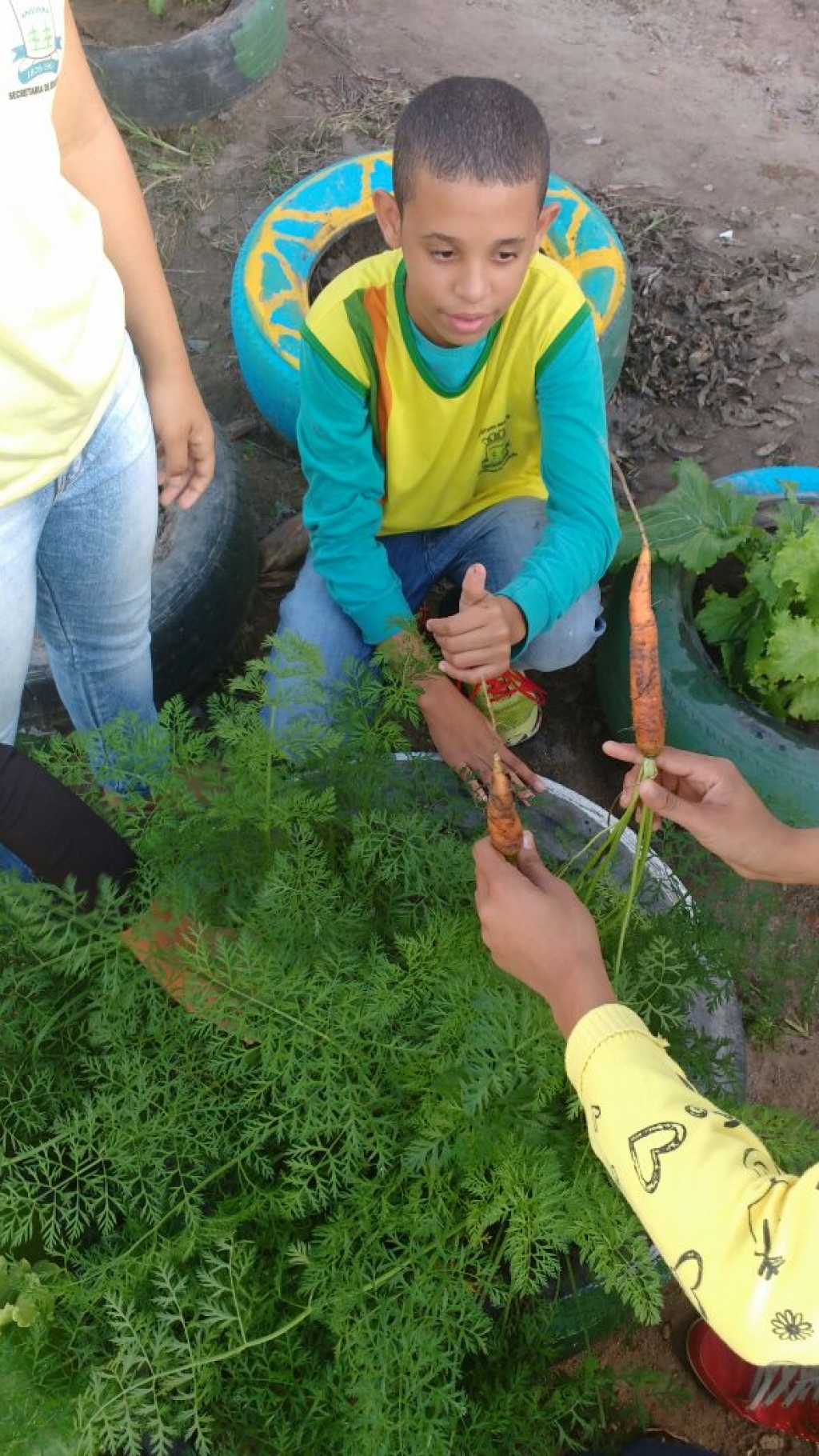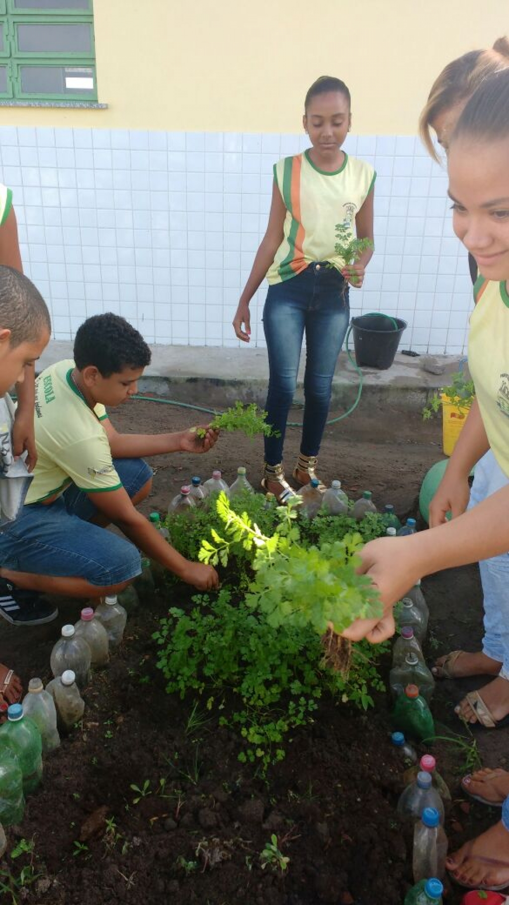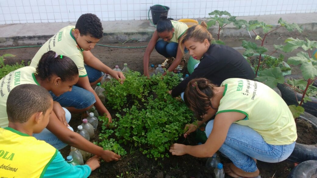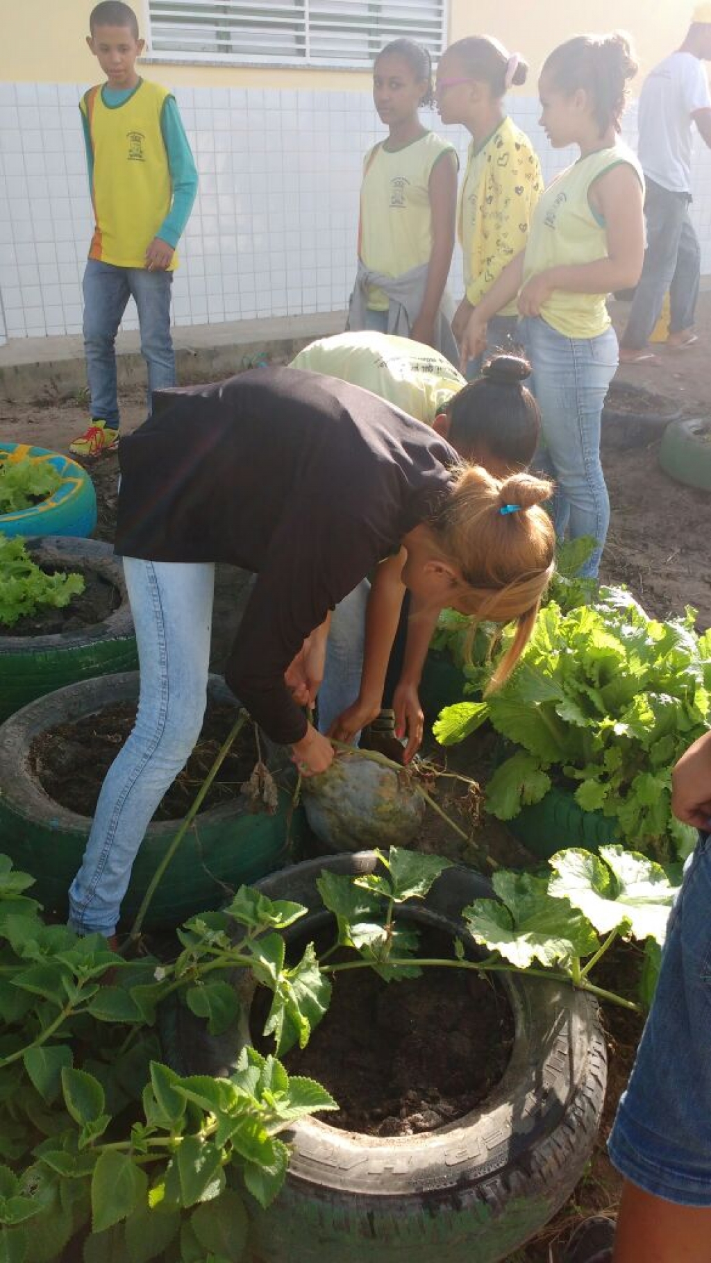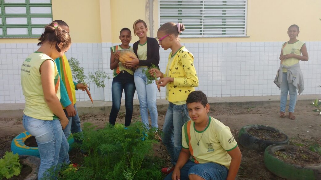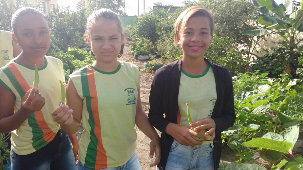 ALUNOS DO 7º ANO MATUTINO, DA ESCOLA MARIA RITA ALVES DE JESUS COLHENDO ALIMENTOS NA HORTA ESCOLAR