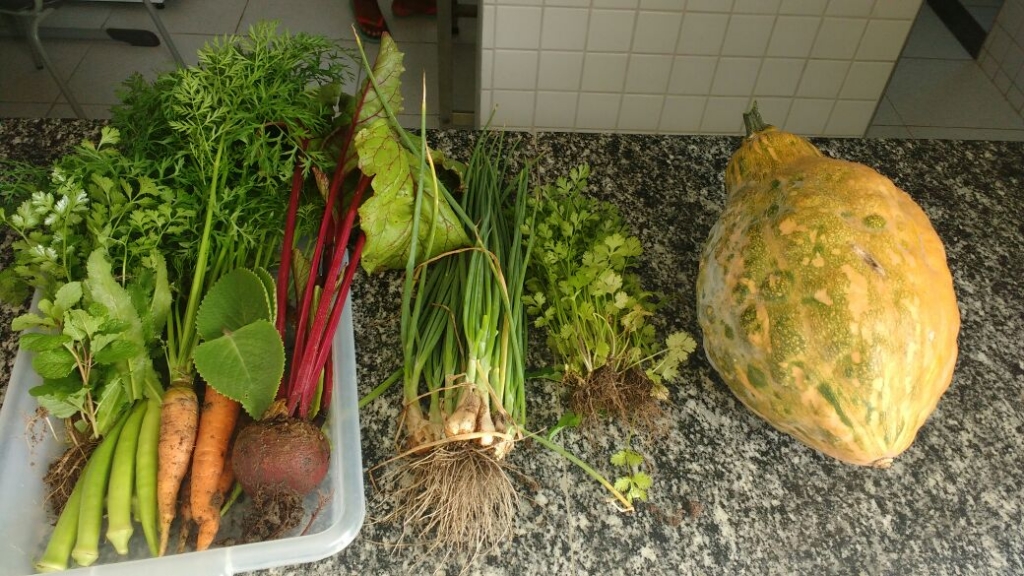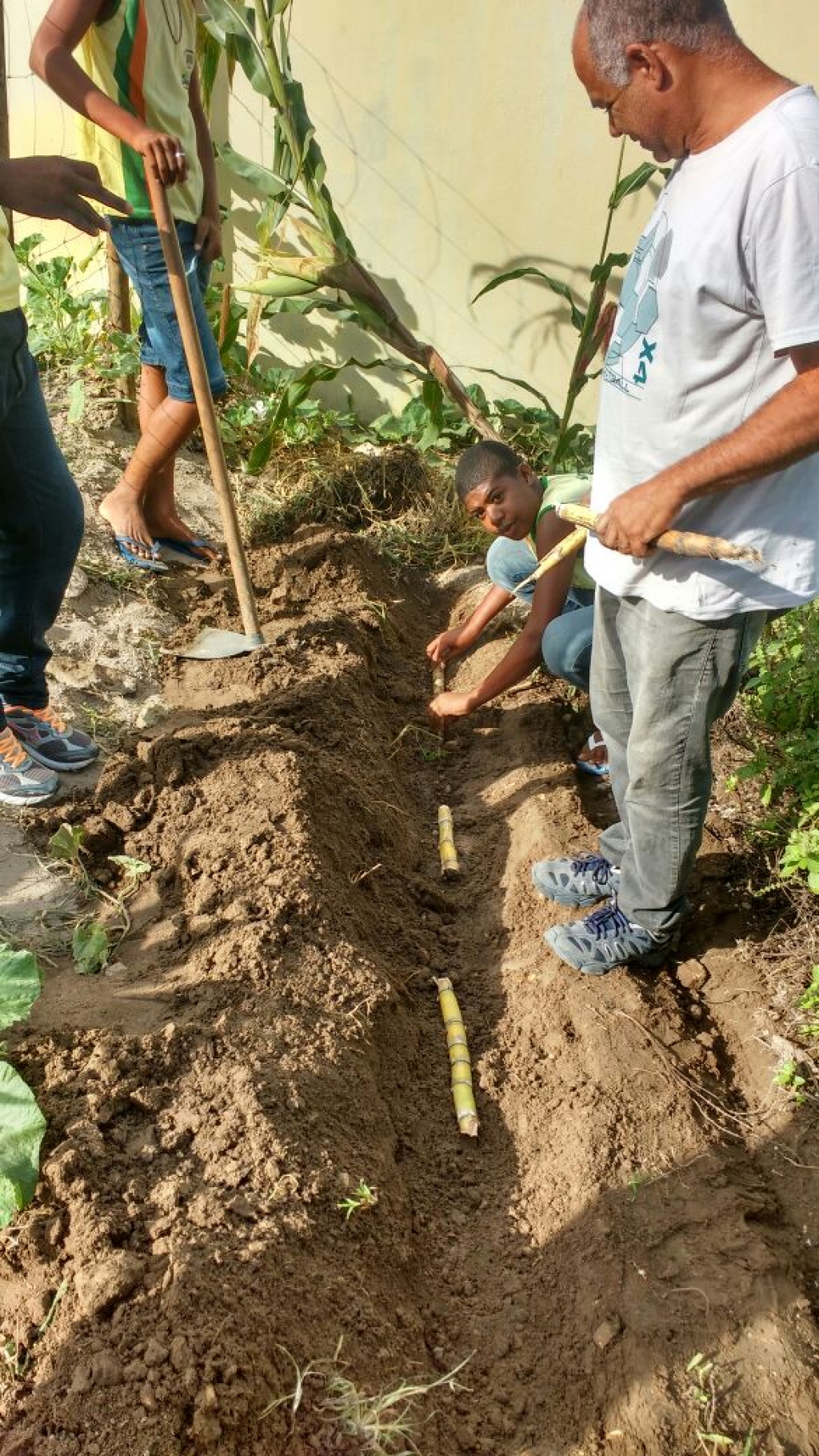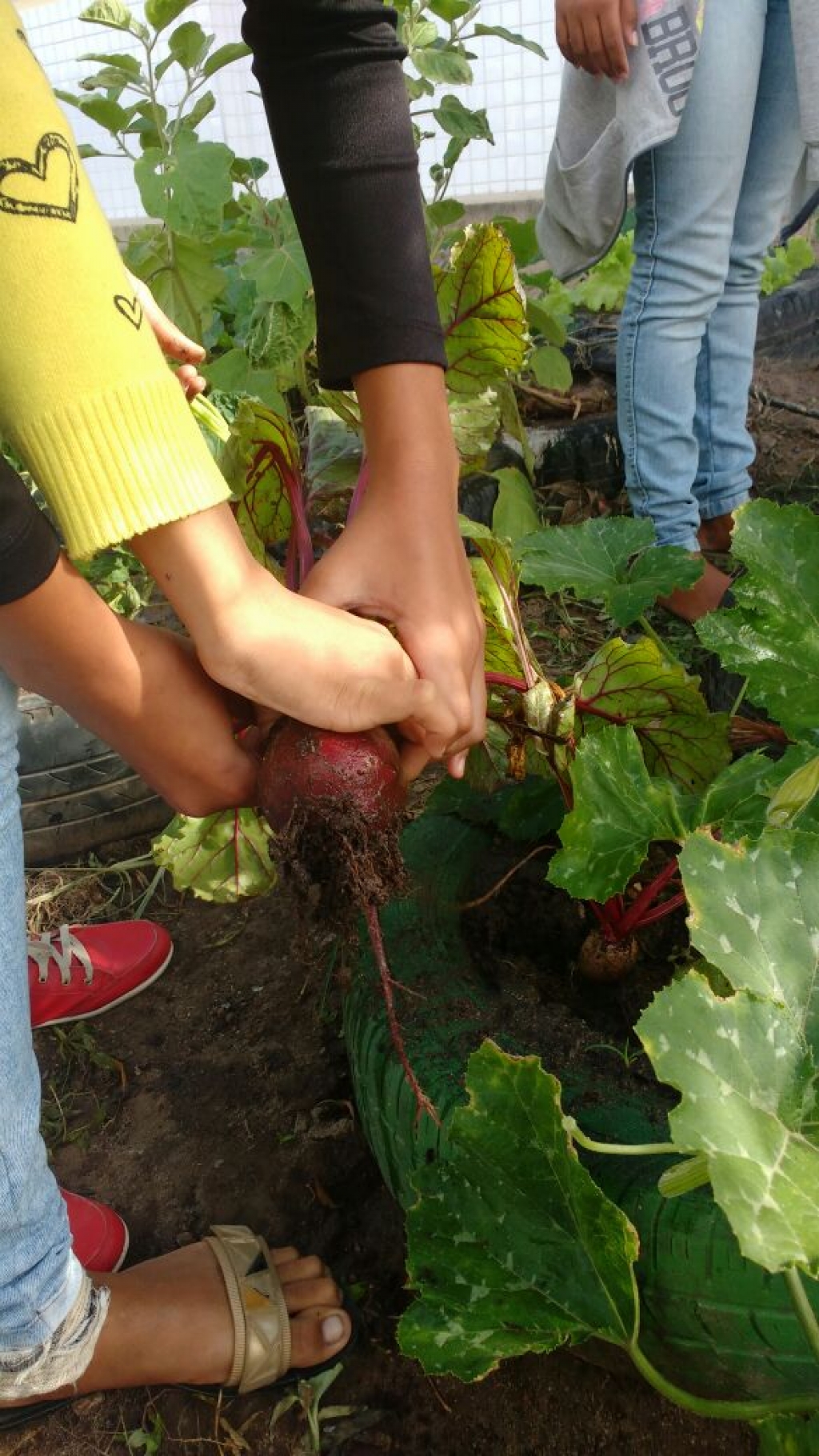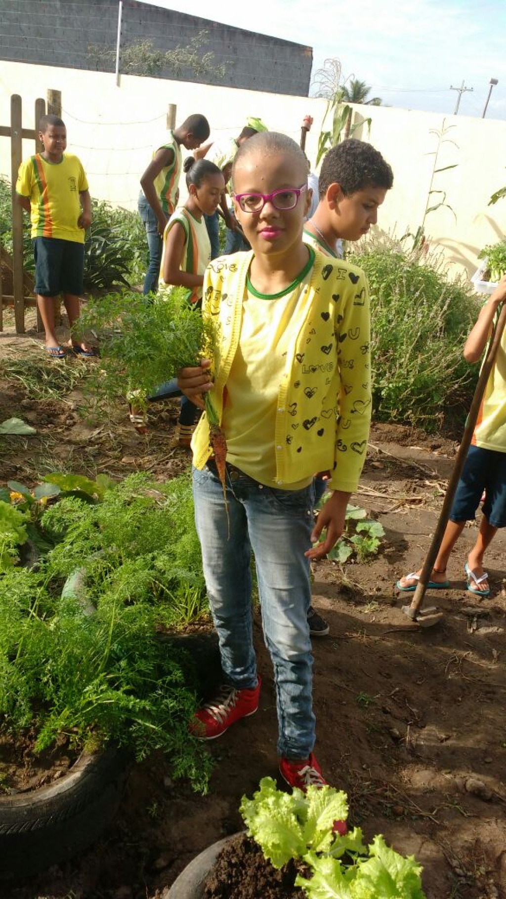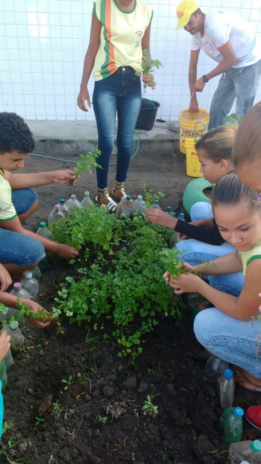 ALUNOS DO 7º ANO MATUTINO, DA ESCOLA MARIA RITA ALVES DE JESUS COLHENDO ALIMENTOS NA HORTA ESCOLAR