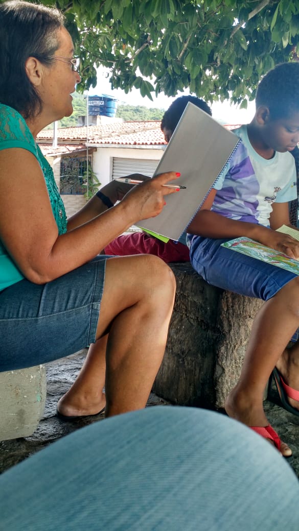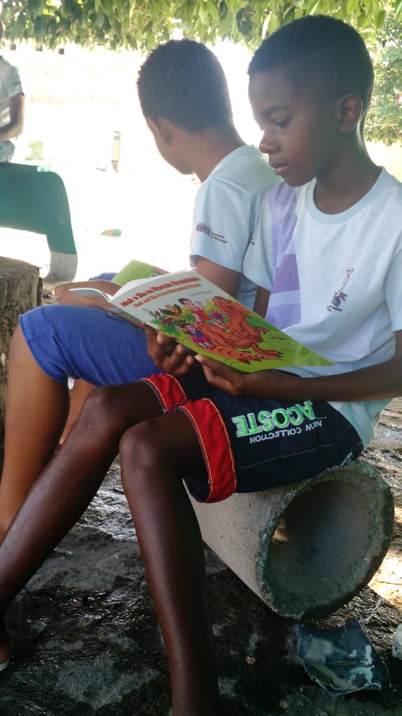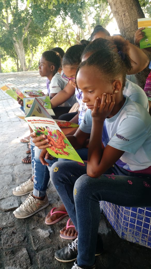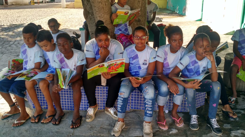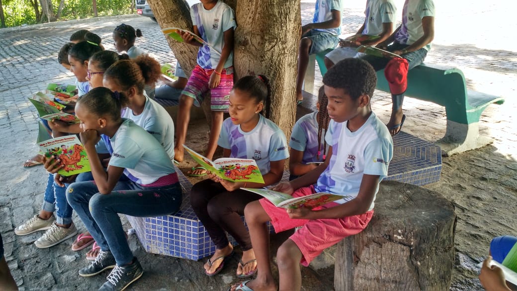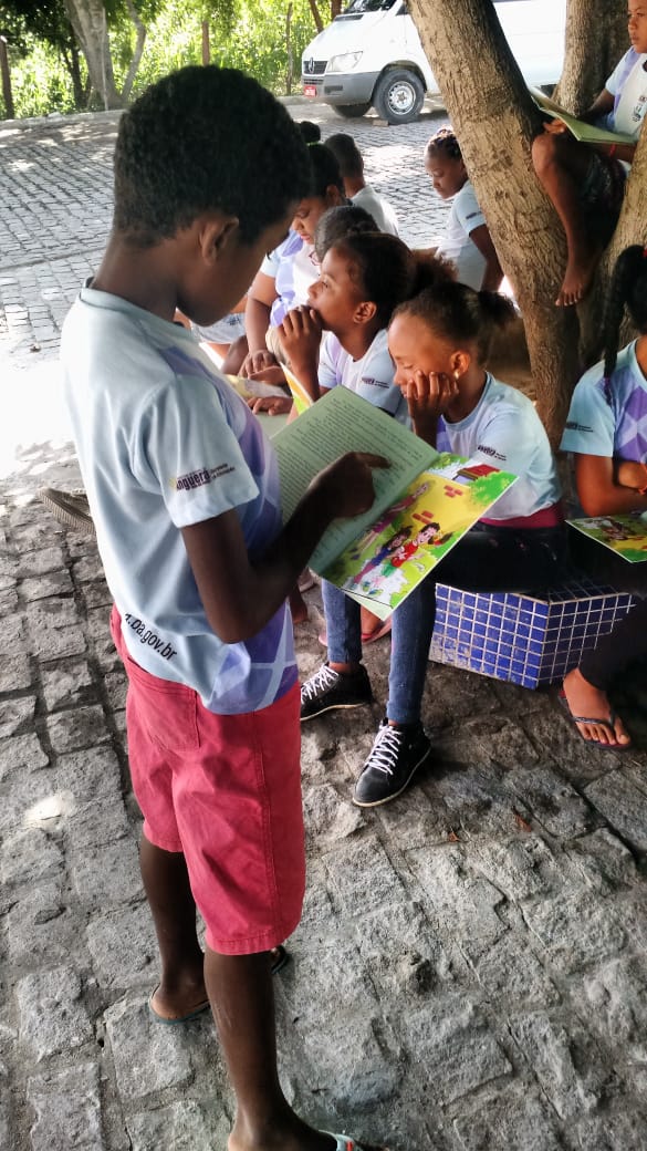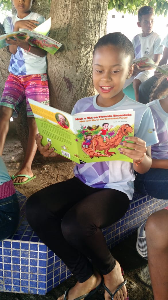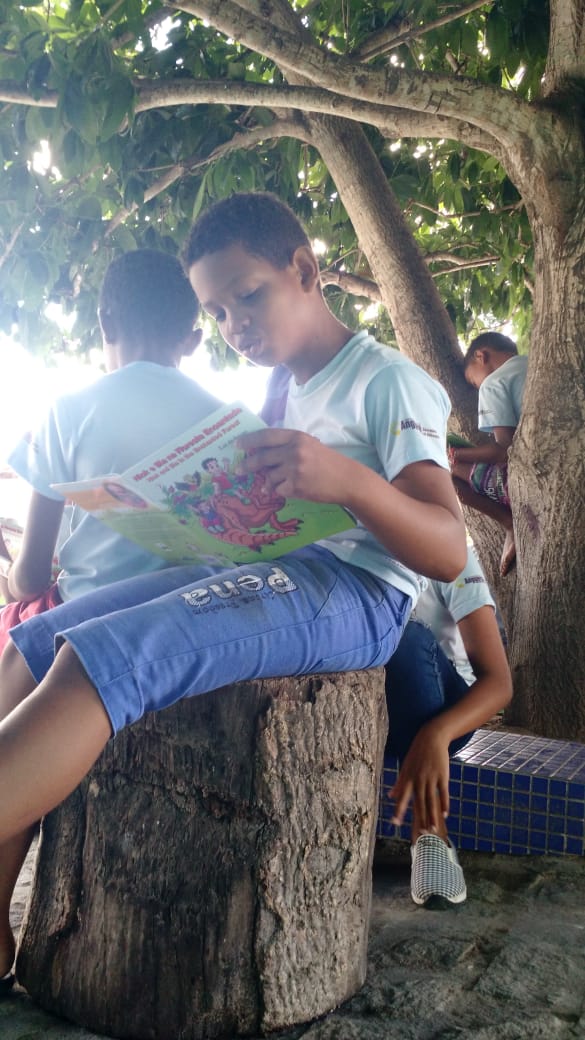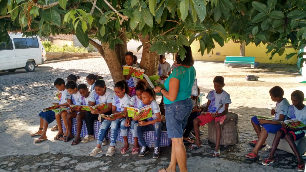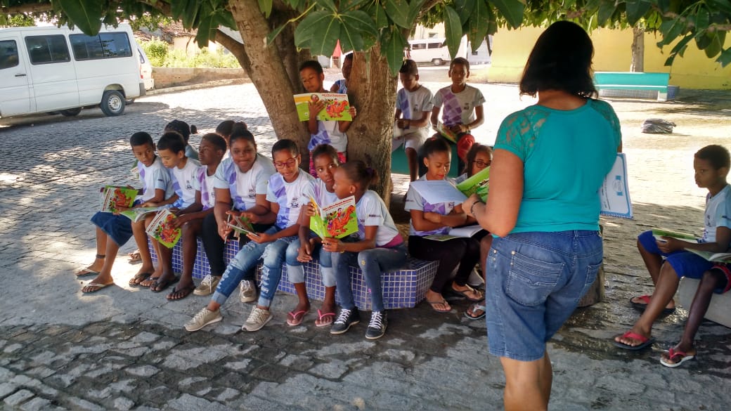 Leitura ao ar livre do livro Nick e Bia na Floresta encantada de Laé de Souza. Alunos do 5° ano da Escola Leôncio Horácio de Almeida se encantaram com esse momento prazeroso de leitura seguido da sequência de atividades do projeto.