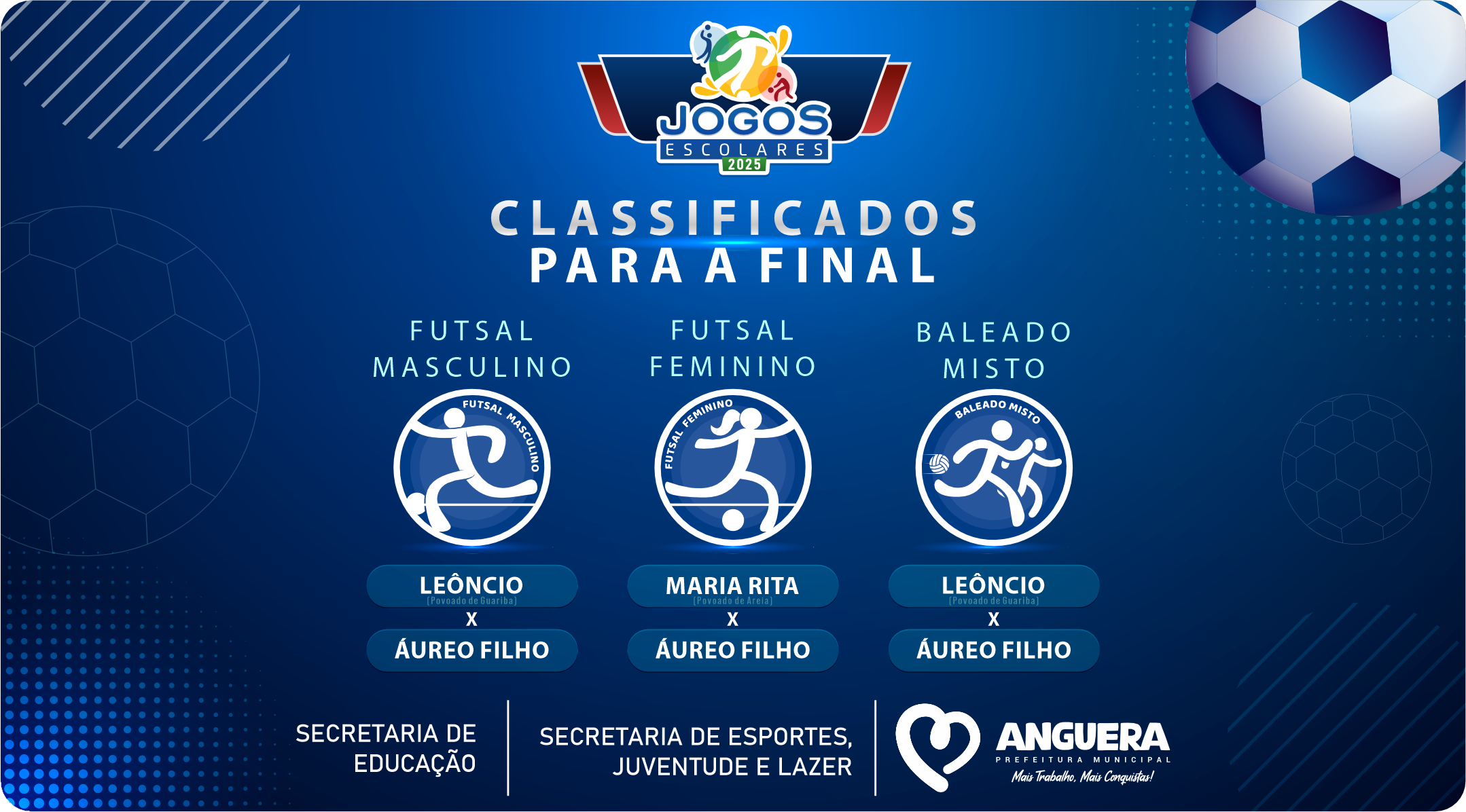 Os Jogos Escolares 2025 encerram nesta sexta-feira, 05/09, com a partida final do Torneio de Futebol, no Estádio Joselito Vieira Neves, entre Áureo Filho X Maria Rita.O time da Escola Maria Rita foi o primeiro que se garantiu na final, tendo eliminado a Escola Leôncio Horácio, no dia 15 de agosto, pelo placar de 2x1. Marcaram para o Maria Rita os jogadores Thauan Alves e Cleiton Cardoso. O gol do Leôncio foi contra, marcado pelo jogador Levi Lopes.Já o time do Áureo Filho, no dia...